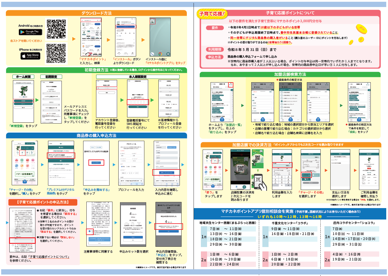 プレミアム付デジタル商品券を購入した子育て世帯を対象に、1世帯あたり 3,000ポイント(マチカネポイント)を付与します。