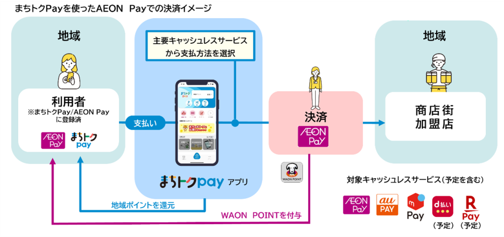 「まちトクPay」は、AEON Pay、au PAY、メルペイ(※五十音順)の3社のキャッシュレスサービスと連携しています。今後d払い®と楽天ペイとも連携予定です。