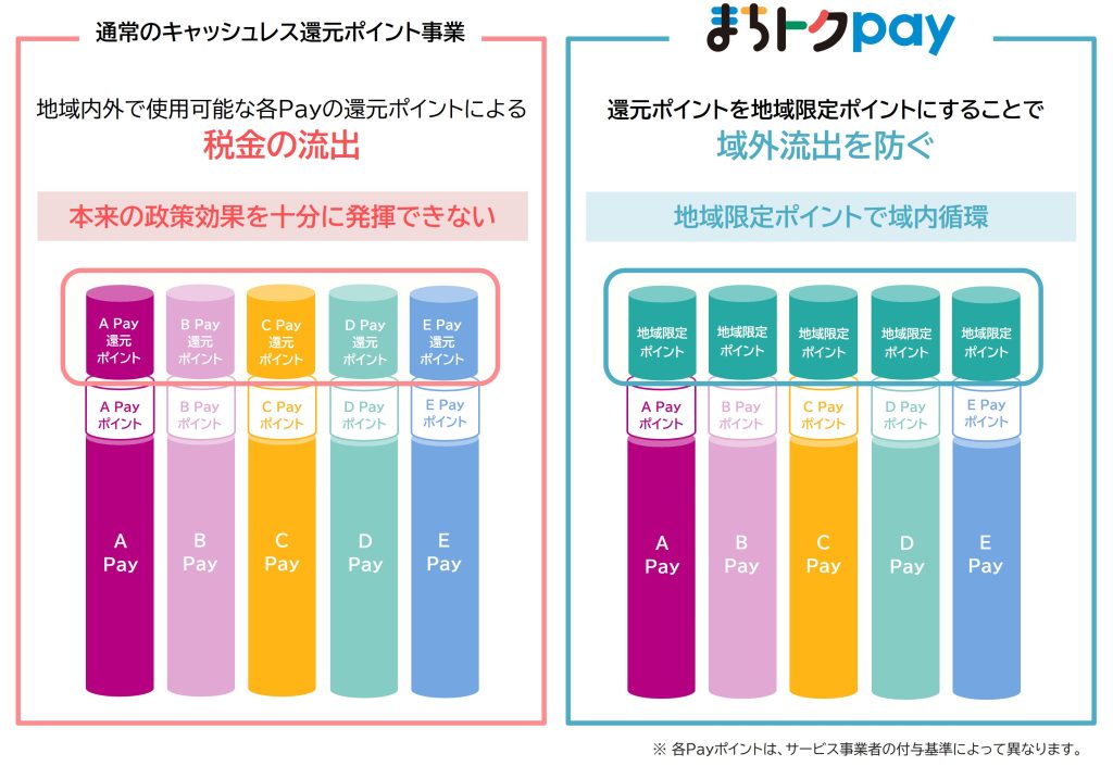 現在も多くの自治体で実施されているキャッシュレスポイント還元事業においては、自治体が税金で負担する還元ポイントの域外流出を防ぐことができないことが課題とされてきました。