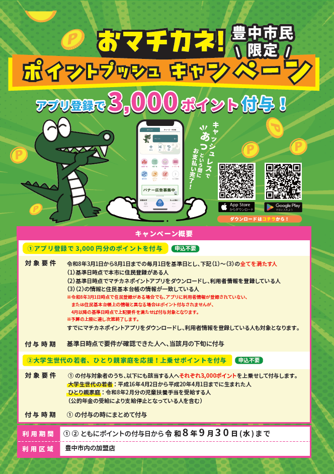 | 対象要件 | 令和8年3月1日から8月1日までの毎月1日を基準日とし、以下すべてを満たす方 1. 基準日時点で豊中市に住民登録がある方 2. 基準日時点で「マチカネポイントアプリ」をダウンロードし、利用者情報を登録している方 3. アプリ登録情報と住民基本台帳情報が一致している方 ※令和8年3月1日時点で住民登録がある場合でも、アプリに利用者情報が登録されていない、または住民基本台帳の情報と異なる場合はポイント付与されませんが、4月以降の基準日時点で上記要件を満たせば付与対象となります。 ※予算の上限に達し次第終了します。 |